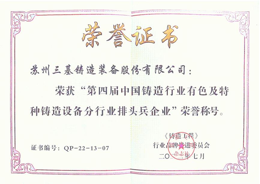 由《鑄造工程》雜志社舉辦的“第四屆中國鑄造行業(yè)綜合百強(qiáng)、分行業(yè)排頭兵企業(yè)”的評(píng)選活動(dòng)中,公司榮獲“第四屆中國鑄造行業(yè)有色及特種鑄造設(shè)備分行業(yè)排頭兵企業(yè)”榮譽(yù)稱號(hào)。
