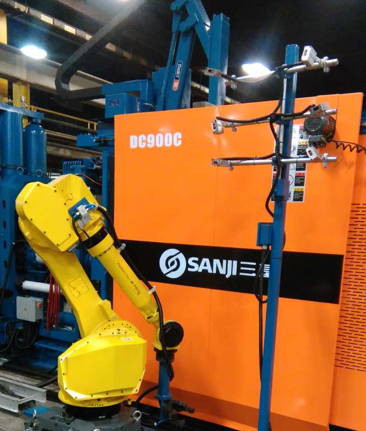 蘇州三基依照美國(guó)的UL認(rèn)證安全要求設(shè)計(jì)了歐美版臥式冷室壓鑄機(jī)系列產(chǎn)品,該產(chǎn)品在電氣控制系統(tǒng)、液壓油路、合模系統(tǒng)、機(jī)座系統(tǒng)等方面進(jìn)行了全新設(shè)計(jì),合模機(jī)構(gòu)的模板、曲肘系統(tǒng)全部采用鑄鋼件,大大提高了壓鑄機(jī)的整體剛性。其中900噸臥式冷室壓鑄機(jī)已于2016年10月份成功銷(xiāo)往美國(guó)市場(chǎng),該設(shè)備采用AB控制系統(tǒng)和美國(guó)VTW實(shí)時(shí)控制系統(tǒng),集成了給湯機(jī)、噴霧機(jī)、取件機(jī)器人、切邊機(jī)等自動(dòng)化設(shè)備,組建了一個(gè)自動(dòng)化壓鑄島,用于汽車(chē)零部件的自動(dòng)化生產(chǎn)。設(shè)備目前正處于安裝調(diào)試階段,將在2017年2月份正是達(dá)產(chǎn)。