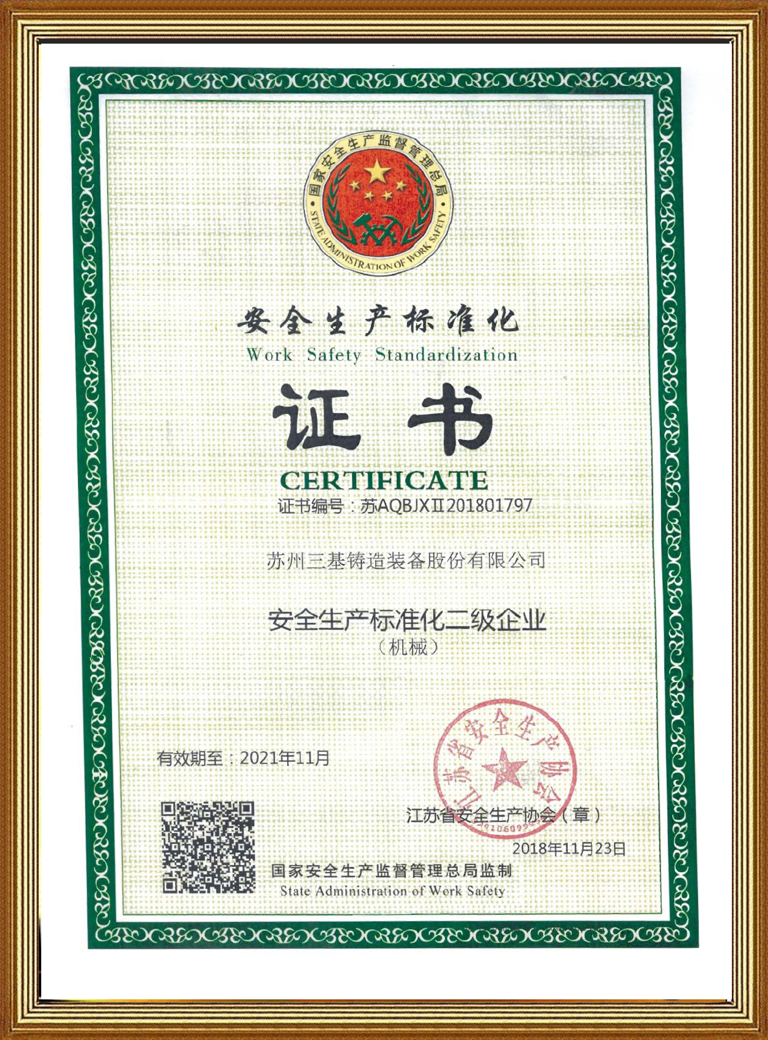 江蘇省安全生產協會專家組通過對蘇州三基鑄造裝備股份有限公司的安全生產標準化管理資料進行審查、現場考察和評估,于2018年11月23日正式認定公司為省級安全生產標準化二級企業(yè),并頒發(fā)了證書。